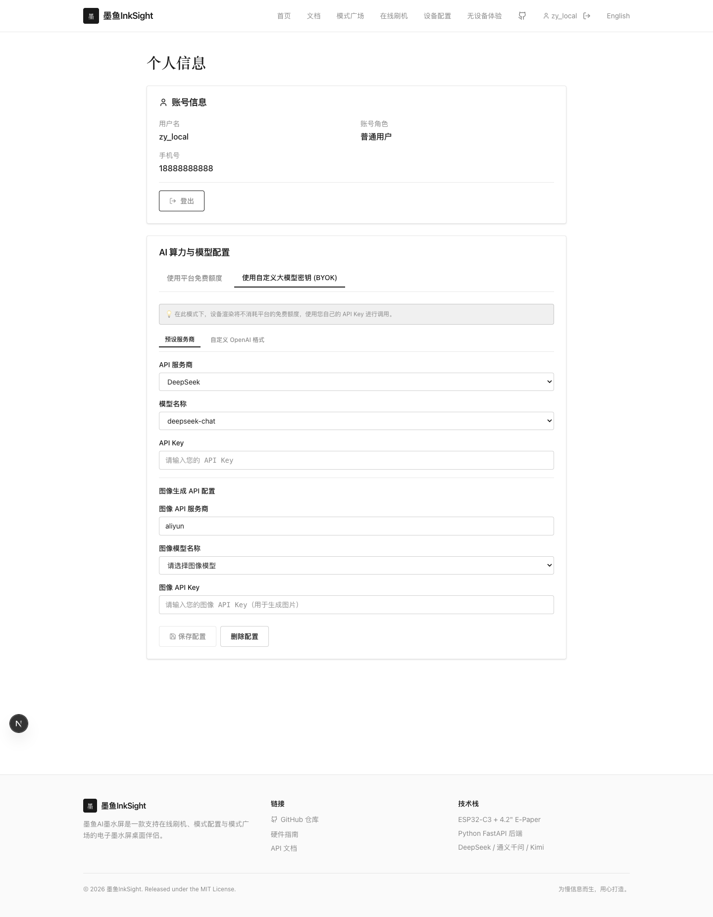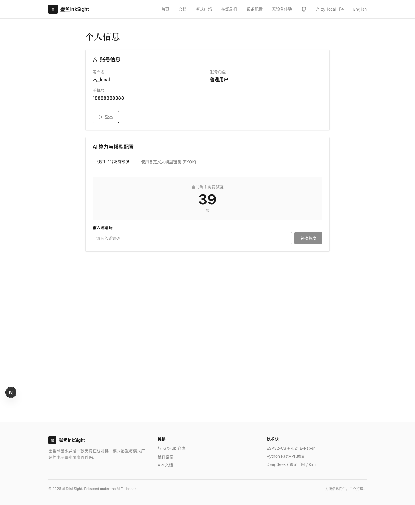 上图是当前已登录状态下的个人信息页。这里会显示你的账号信息、剩余免费额度,以及 AI 配置入口。