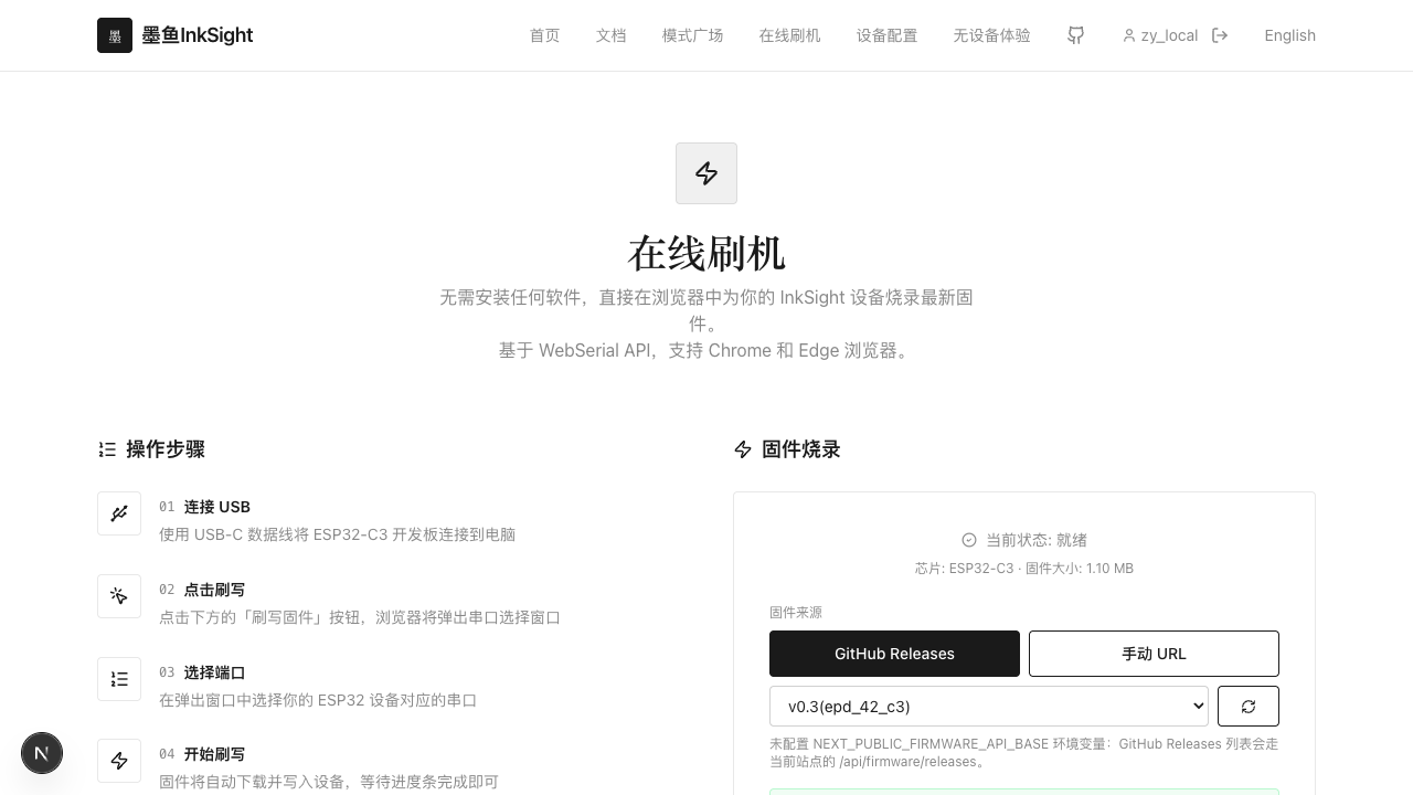 刷机页已经把操作步骤、固件来源和控制台日志放在同一个页面里,适合新手按步骤完成。